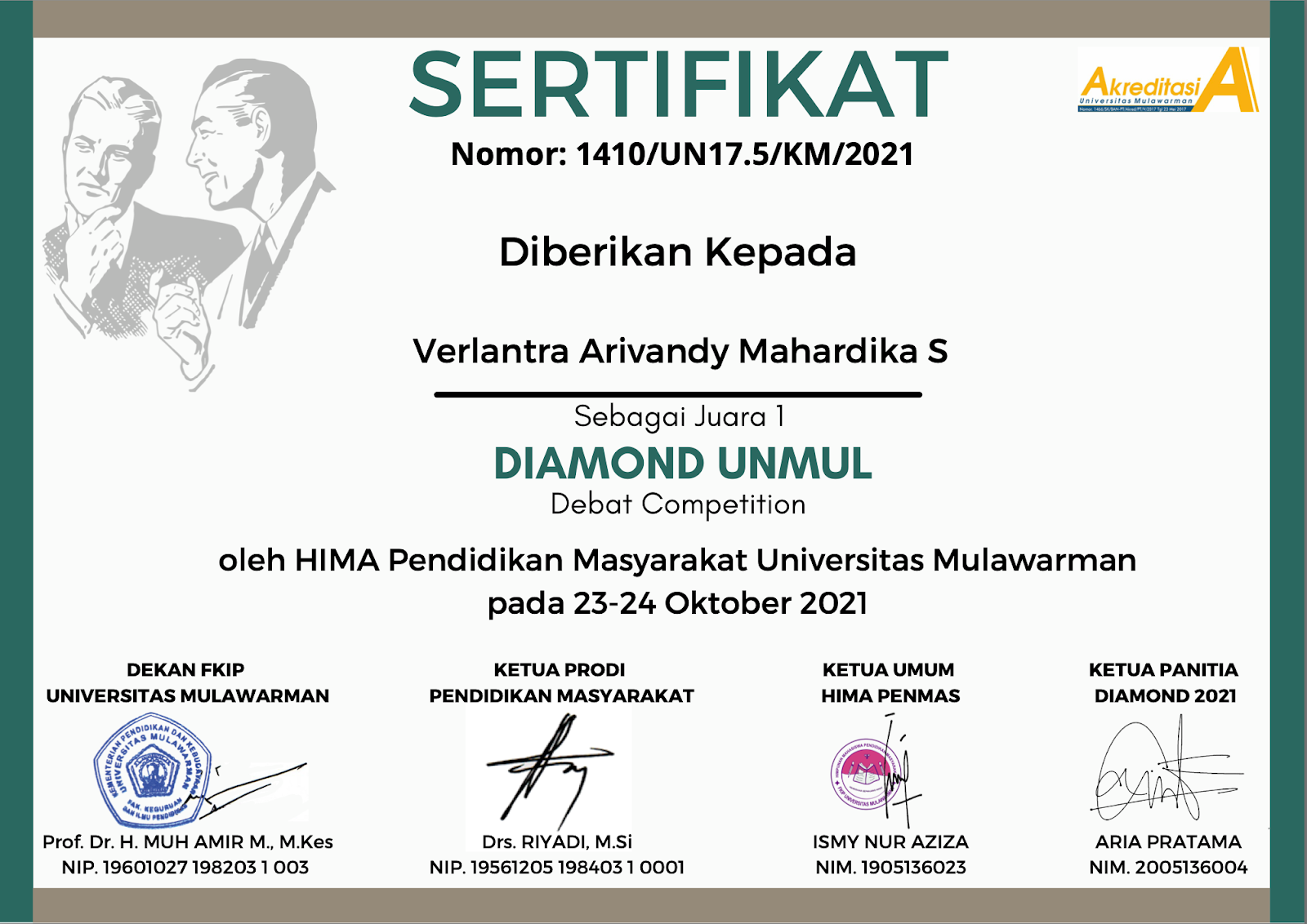 Mahasiswa Program Studi Hubungan Internasional (HI) Fakultas Ilmu Sosial dan Ilmu Politik (FISIP) Universitas Diponegoro kembali mengukir prestasi di tingkat nasional. Verlantra Arivandy Mahardika S berhasil meraih Juara 1 dalam ajang Diamond UNMUL Debate Competition 2021, yang diselenggarakan oleh Himpunan Mahasiswa Pendidikan Masyarakat Universitas Mulawarman.