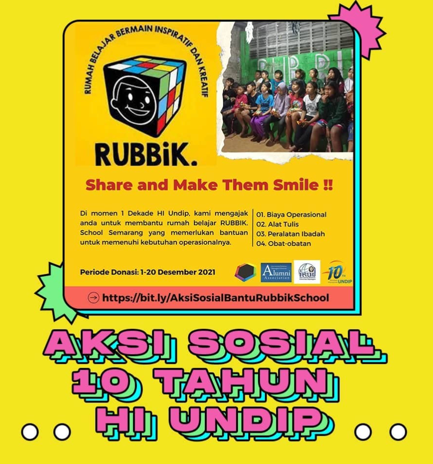 Dalam rangka memperingati 10 tahun berdirinya Prodi Hubungan Internasional (HI) UNDIP, Himpunan Mahasiswa Program Studi Hubungan Internasional bekerja sama dengan para alumni menyelenggarakan Aksi Sosial yang difokuskan pada bidang pendidikan. Kegiatan ini bertujuan memberikan dukungan bagi anak-anak yang berada di lingkungan kurang beruntung agar memperoleh kesempatan pendidikan yang setara.