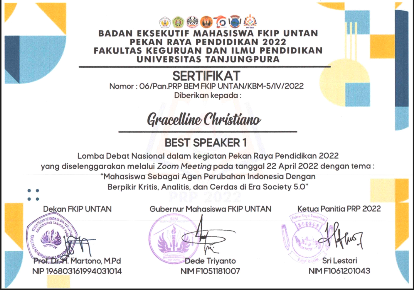 Prestasi membanggakan kembali diraih oleh mahasiswa Program Studi Hubungan Internasional (HI) Fakultas Ilmu Sosial dan Ilmu Politik (FISIP) Universitas Diponegoro (Undip). Gracelline Christiano berhasil meraih penghargaan Best Speaker 1 dalam ajang Lomba Debat Nasional Pekan Raya Pendidikan 2022 yang diselenggarakan oleh Badan Eksekutif Mahasiswa (BEM) Fakultas Keguruan dan Ilmu Pendidikan (FKIP) Universitas Tanjungpura.