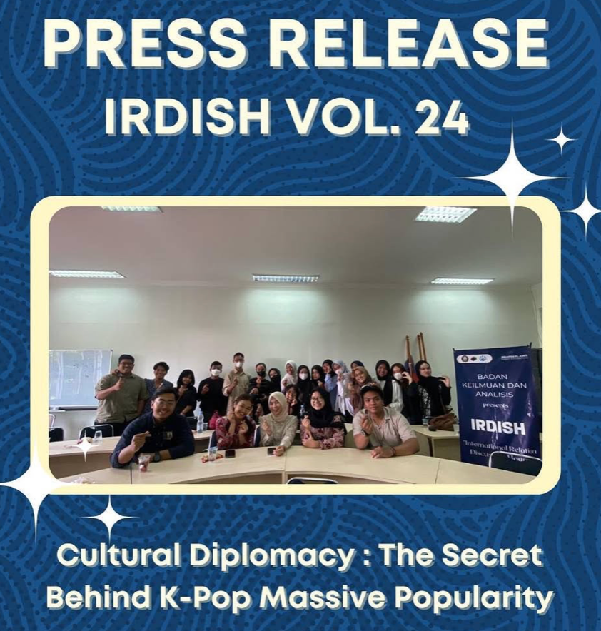 Pada Rabu, 15 Maret 2023, Bidang Keilmuan dan Analisis (BKA) HMPS HI Universitas Diponegoro menyelenggarakan IRDISH perdana di tahun 2023 dengan mengusung topik “Cultural Diplomacy: The Secret Behind K-Pop Massive Popularity”. Diskusi ini difasilitasi oleh dua moderator, yaitu Alyaa Hasna Syifa (HI Undip 2020) dan Shilcia Evrillia Br. Tarigan (HI Undip 2021), serta dihadiri oleh 17 peserta di Laboratorium Diplomasi HI.