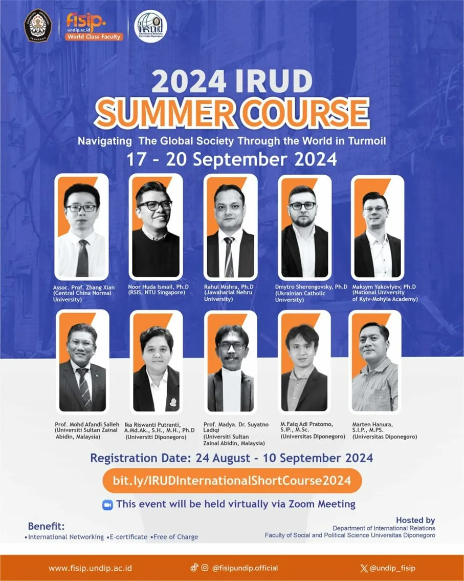 IRUD Summer Course is a short course held by the Department of International Relations, Faculty of Social and Political Science, Universitas Diponegoro, Semarang, Indonesia. IRUD Summer Course takes the form of a series of online lectures and activities, attended by international and domestic participants. This program is held annually and concentrates on current issues in international relations, delivered by academicians and professionals in order to provide a vast experience for all participants.